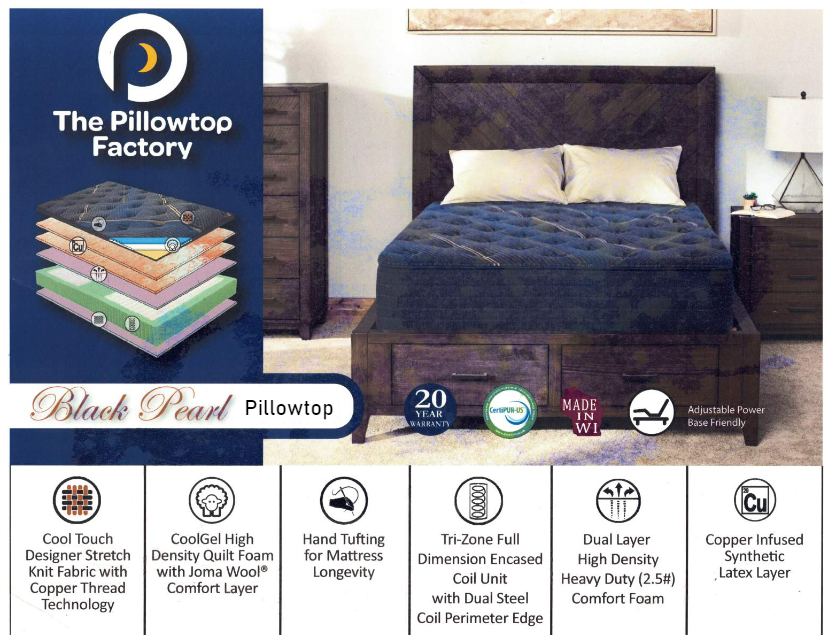 This certificate is for the Black Pearl Mattress & Box Spring Only. Bases are available at The Pillowtop Factory for additional charge.